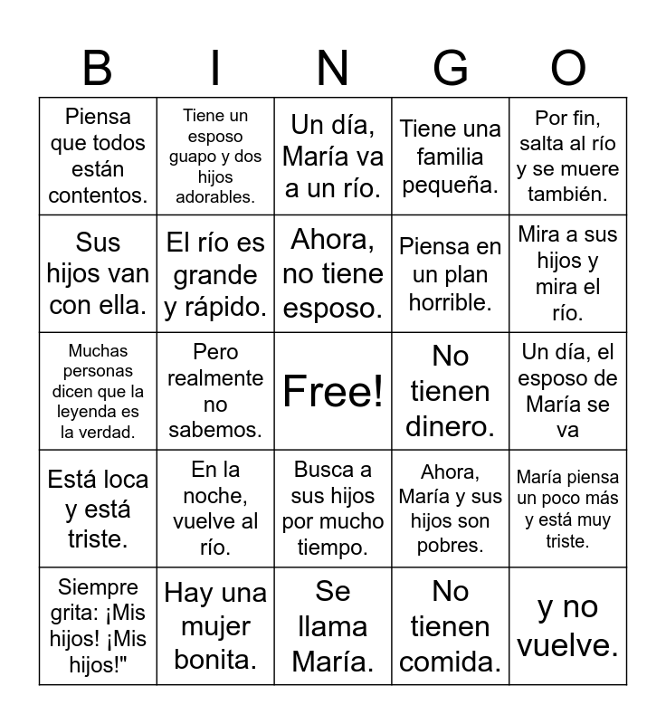 This bingo card has a free space and 31 words: Se llama María., Siguen gritando: "¡Quiero ver a papá! y ¡Quiero comer!", Pero realmente no sabemos., Ahora, se llama La Llorona., Piensa que todos están contentos., Un día, María va a un río., El río es grande y rápido., Ahora, María y sus hijos son pobres., No tienen dinero., No tienen comida., Un día, el esposo de María se va, y no vuelve., En poco tiempo, se mueren., Y... empuja a sus hijos en el río., Mira a sus hijos y mira el río., Y María se va., María piensa un poco más y está muy triste., En la noche, vuelve al río., Está loca y está triste., Busca a sus hijos por mucho tiempo., Por fin, salta al río y se muere también., Muchas personas dicen que María vuelve en la noche., Siempre grita: ¡Mis hijos! ¡Mis hijos!", Tiene un esposo guapo y dos hijos adorables., Piensa en un plan horrible., Sus hijos van con ella., Tiene una familia pequeña., Muchas personas dicen que la leyenda es la verdad., Hay una mujer bonita., Ahora, no tiene esposo. and Ahora, siempre está triste..