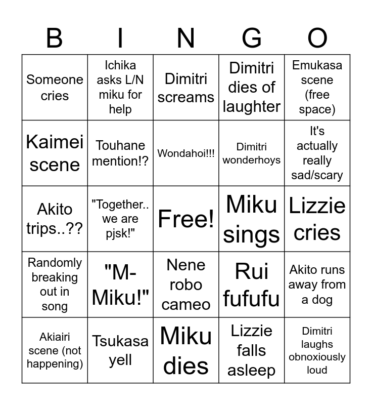 This bingo card has a free space and 24 words: "M-Miku!", Tsukasa yell, Wondahoi!!!, Akiairi scene (not happening), Emukasa scene (free space), Someone cries, Kaimei scene, Ichika asks L/N miku for help, Miku sings, Nene robo cameo, Dimitri wonderhoys, Akito trips..??, Rui fufufu, Akito runs away from a dog, Touhane mention!?, Lizzie falls asleep, Lizzie cries, Dimitri screams, It's actually really sad/scary, "Together.. we are pjsk!", Dimitri laughs obnoxiously loud, Randomly breaking out in song, Dimitri dies of laughter and Miku dies.