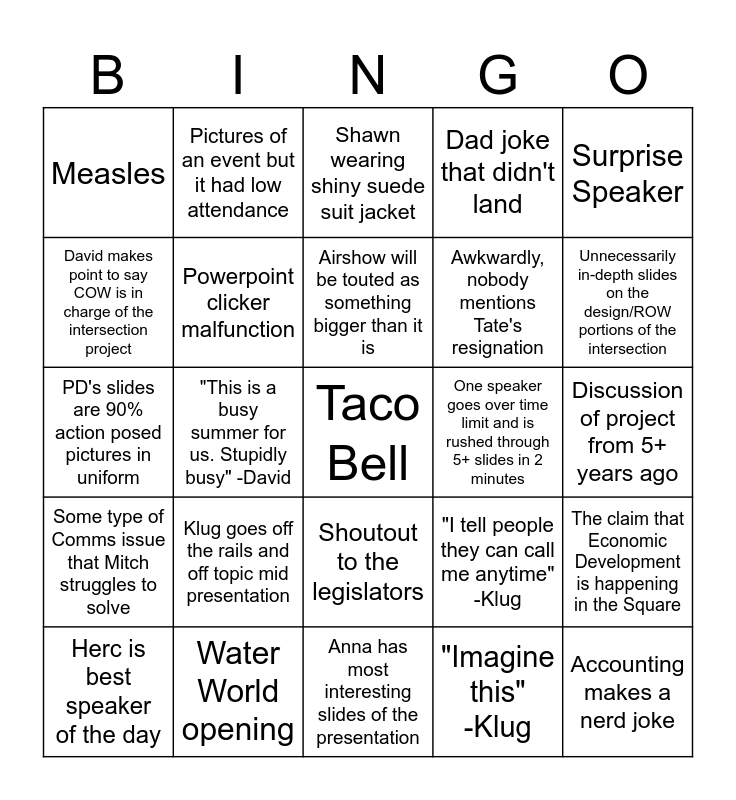 This bingo card has a free space and 24 words: Klug goes off the rails and off topic mid presentation, Water World opening, Airshow will be touted as something bigger than it is, Herc is best speaker of the day, Surprise Speaker, Measles, David makes point to say COW is in charge of the intersection project, Pictures of an event but it had low attendance, One speaker goes over time limit and is rushed through 5+ slides in 2 minutes, Shoutout to the legislators, Awkwardly, nobody mentions Tate's resignation, PD's slides are 90% action posed pictures in uniform, "I tell people they can call me anytime" -Klug, The claim that Economic Development is happening in the Square, Powerpoint clicker malfunction, "Imagine this" -Klug, Discussion of project from 5+ years ago, Shawn wearing shiny suede suit jacket, Unnecessarily in-depth slides on the design/ROW portions of the intersection, "This is a busy summer for us. Stupidly busy" -David, Accounting makes a nerd joke, Some type of Comms issue that Mitch struggles to solve, Dad joke that didn't land and Anna has most interesting slides of the presentation.