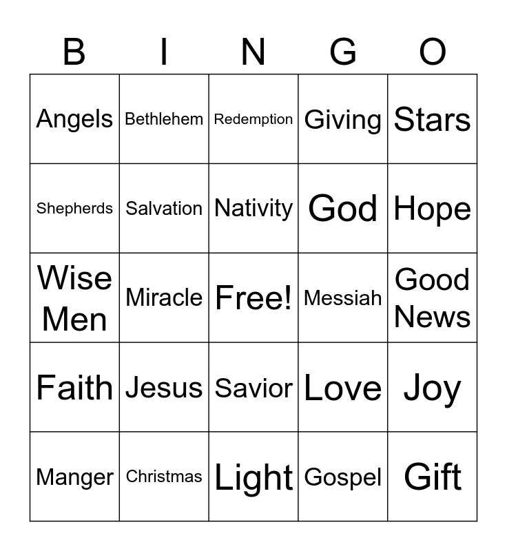 This bingo card has a free space and 24 words: Jesus, Christmas, Nativity, Manger, Stars, Angels, Shepherds, Bethlehem, Messiah, Savior, God, Wise Men, Love, Joy, Salvation, Gospel, Good News, Redemption, Hope, Miracle, Gift, Faith, Giving and Light.