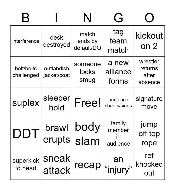 This bingo card has a free space and 53 words: wrestler rolls out of danger, ref knocked out, sunglasses, an “injury”, brawl erupts, folding table, desk destroyed, diving out of ring, belt/belts challenged, bounce off ropes, outlandish jacket/coat, a new enemy emerges, jump off top rope, family member in audience, match won by cheating, superkick to head, someone looks smug, audience chants/sings, another wrestler comes to the rescue, kickout on 2, sleeper hold, someone looks angry, a new alliance forms, interference, bathroom match, sneak attack, folding chair, wrestler uses catchphrase, stupid fan poster, wrestler returns after absence, cheesy into graphics, product ad features wrestler, rolled back into ring, lightshow, stairs as weapon, smashed against turnbuckle, tag team match, recap, match ends by default/DQ, someone looks happy, match has theme (gimmick), backstage drama, signature move, slide under ropes, wrestler in mask, body slam, sucker punch, signature prop, suplex, DDT, frogsplash, moonsault and leg drop.