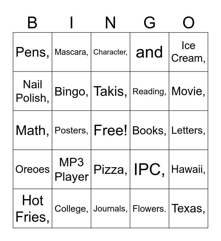 This bingo card has a free space and 25 words: MP3 Player, Journals,, Takis,, Hot Fries,, Ice Cream,, Pens,, Nail Polish,, Mascara,, Books,, Pizza,, Reading,, Math,, IPC,, Hawaii,, Bingo,, Cake,, Letters,, Character,, Movie,, Posters,, Texas,, College,, Oreoes, and and Flowers..
