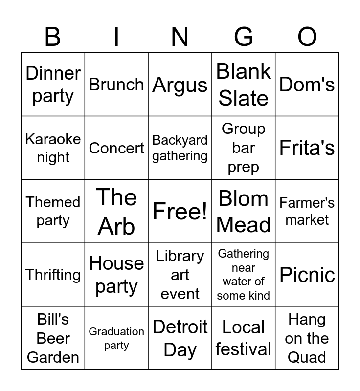This bingo card has a free space and 24 words: House party, Graduation party, Backyard gathering, Bill's Beer Garden, Dom's, Dinner party, Karaoke night, Brunch, Blom Mead, Library art event, Group bar prep, Themed party, Gathering near water of some kind, Picnic, Concert, Local festival, Farmer's market, Argus, Frita's, The Arb, Hang on the Quad, Thrifting, Blank Slate and Detroit Day.