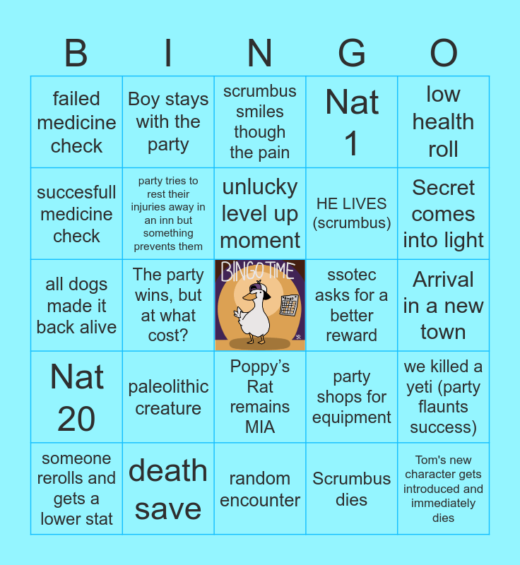This bingo card has a free space and 24 words: paleolithic creature, death save, unlucky level up moment, someone rerolls and gets a lower stat, low health roll, failed medicine check, succesfull medicine check, Boy stays with the party, ssotec asks for a better reward, Poppy’s Rat remains MIA, HE LIVES (scrumbus), all dogs made it back alive, party shops for equipment, we killed a yeti (party flaunts success), party tries to rest their injuries away in an inn but something prevents them, Scrumbus dies, Arrival in a new town, scrumbus smiles though the pain, Secret comes into light, The party wins, but at what cost?, Tom's new character gets introduced and immediately dies, Nat 20, Nat 1 and random encounter.