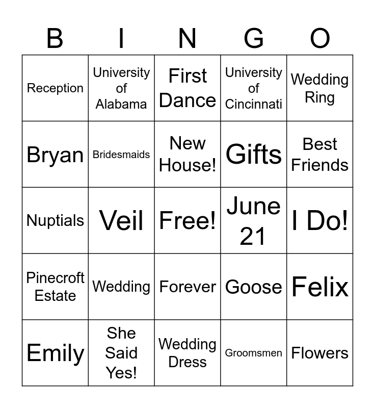 This bingo card has a free space and 29 words: Emily, Honeymoon, Veil, Engagement, Reception, First Dance, Bridesmaids, Wedding, June 21, She Said Yes!, I Do!, Flowers, Wedding Dress, Groomsmen, Best Friends, Love, Forever, Pinecroft Estate, Wedding Ring, Nuptials, Goose, Rehearsal Dinner, Gifts, Bryan, University of Cincinnati, University of Alabama, Felix, New House! and Wedding Photos.