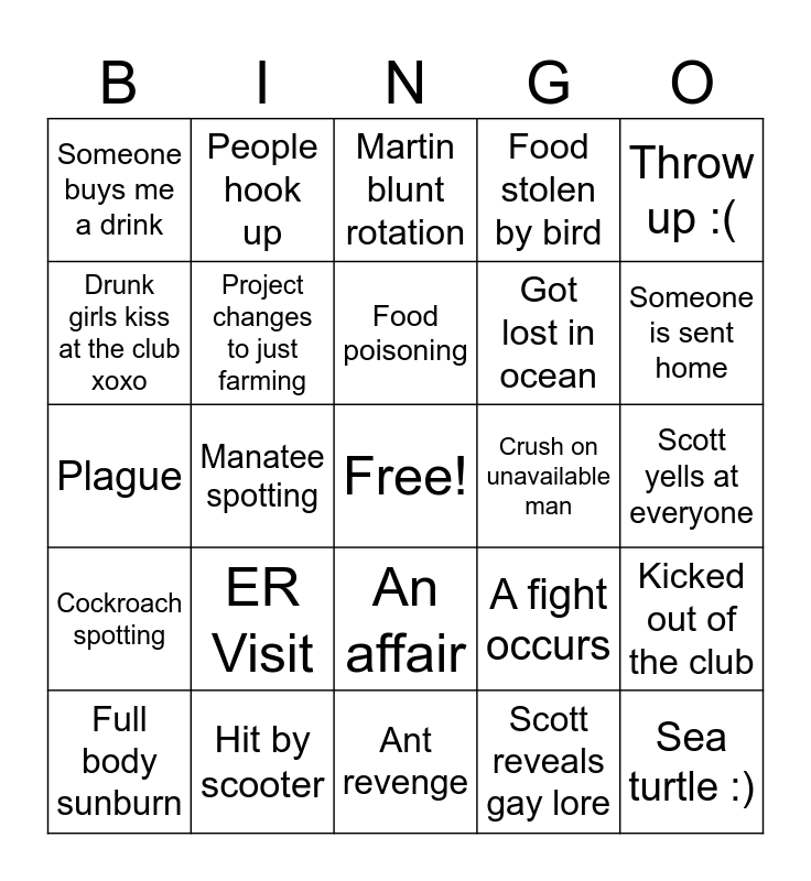 This bingo card has a free space and 24 words: ER Visit, Hit by scooter, Food poisoning, Full body sunburn, Throw up :(, Someone buys me a drink, Drunk girls kiss at the club xoxo, People hook up, Crush on unavailable man, An affair, Got lost in ocean, Plague, A fight occurs, Kicked out of the club, Project changes to just farming, Scott reveals gay lore, Scott yells at everyone, Martin blunt rotation, Someone is sent home, Manatee spotting, Sea turtle :), Cockroach spotting, Food stolen by bird and Ant revenge.