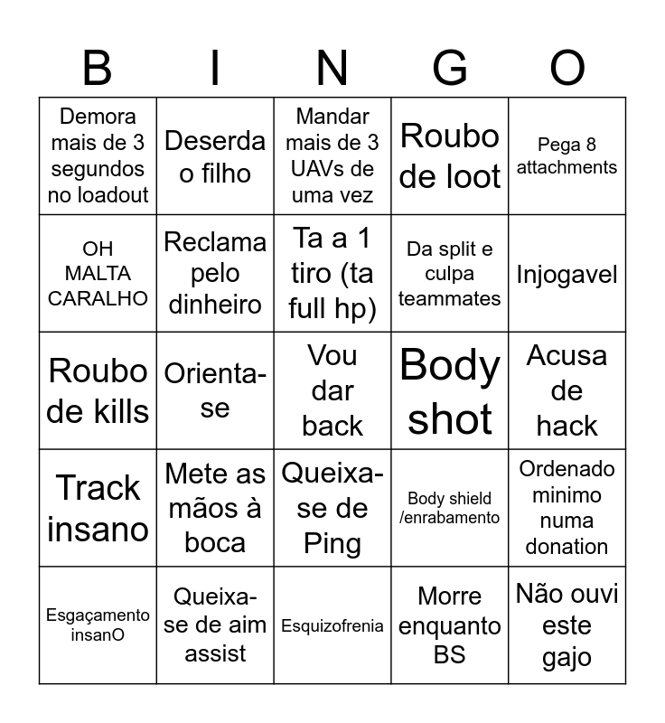 This bingo card has a free space and 24 words: Mete as mãos à boca, Queixa-se de aim assist, Ta a 1 tiro (ta full hp), Esgaçamento insanO, Pega 8 attachments, Demora mais de 3 segundos no loadout, OH MALTA CARALHO, Deserda o filho, Body shot, Queixa-se de Ping, Da split e culpa teammates, Roubo de kills, Body shield /enrabamento, Ordenado minimo numa donation, Reclama pelo dinheiro, Morre enquanto BS, Acusa de hack, Mandar mais de 3 UAVs de uma vez, Injogavel, Orienta-se, Não ouvi este gajo, Track insano, Roubo de loot and Esquizofrenia.