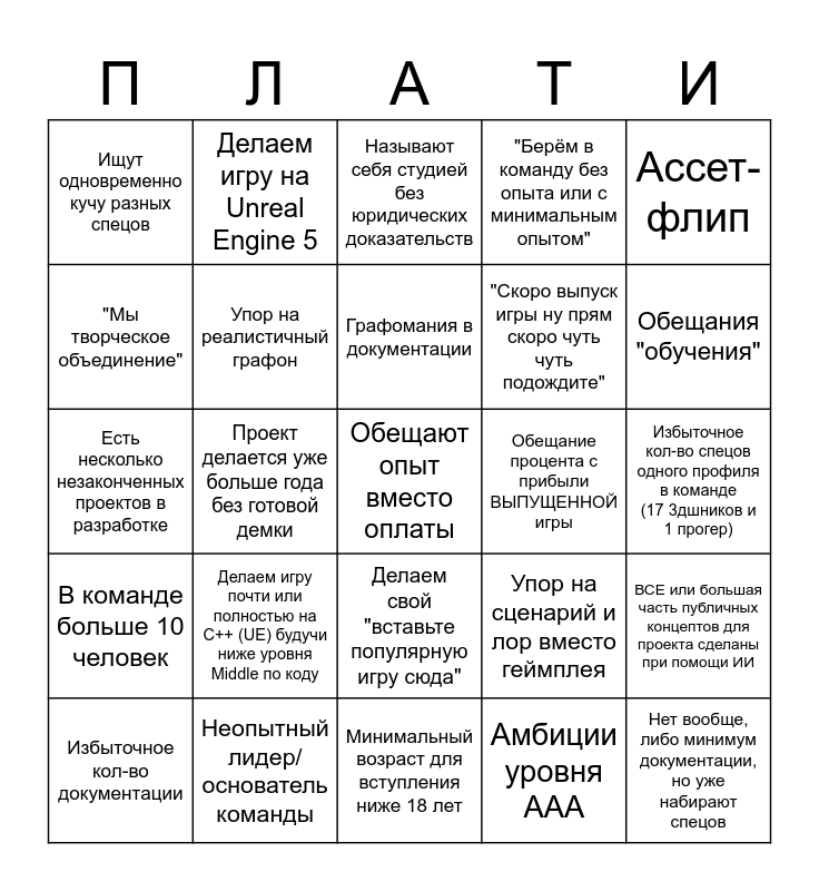 This bingo card has a free space and 24 words: Делаем игру почти или полностью на С++ (UE) будучи ниже уровня Middle по коду, Неопытный лидер/основатель команды, Графомания в документации, Избыточное кол-во документации, Ассет-флип, Ищут одновременно кучу разных спецов, "Мы творческое объединение", Делаем игру на Unreal Engine 5, Обещание процента с прибыли ВЫПУЩЕННОЙ игры, Делаем свой "вставьте популярную игру сюда", "Скоро выпуск игры ну прям скоро чуть чуть подождите", Есть несколько незаконченных проектов в разработке, Упор на сценарий и лор вместо геймплея, ВСЕ или большая часть публичных концептов для проекта сделаны при помощи ИИ, Упор на реалистичный графон, Амбиции уровня AAA, Избыточное кол-во спецов одного профиля в команде (17 3дшников и 1 прогер), Называют себя студией без юридических доказательств, Обещания "обучения", Проект делается уже больше года без готовой демки, Нет вообще, либо минимум документации, но уже набирают спецов, В команде больше 10 человек, "Берём в команду без опыта или с минимальным опытом" and Минимальный возраст для вступления ниже 18 лет.