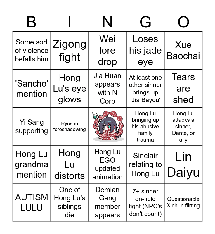 This bingo card has a free space and 24 words: Hong Lu distorts, One of Hong Lu's siblings die, Jia Huan appears with N Corp, AUTISM LULU, Xue Baochai, Some sort of violence befalls him, 'Sancho' mention, Zigong fight, Hong Lu bringing up his abusive family trauma, Hong Lu EGO updated animation, At least one other sinner brings up 'Jia Bayou', Yi Sang supporting, Sinclair relating to Hong Lu, Lin Daiyu, Hong Lu's eye glows, 7+ sinner on-field fight (NPC's don't count), Hong Lu attacks a sinner, Dante, or ally, Wei lore drop, Tears are shed, Ryoshu foreshadowing, Questionable Xichun flirting, Hong Lu grandma mention, Loses his jade eye and Demian Gang member appears.