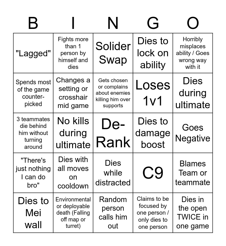 This bingo card has a free space and 72 words: Goes into team alone, Fights more than 1 person by himself and dies, No kills during ultimate, Death to bad positioning, Over extends, Fat Fingers a key, Dies to lock on ability, Dies while sandwiched away from team, Loses 1v1, Loses against the person he's countering, Dies to Mei wall, Outburst of rage, Dies during ultimate, "Lagged", Spends an entire life shooting the tank and nobody else, 3 teammates die behind him without turning around, C9, Horribly misplaces ability / Goes wrong way with it, Lost more points than the game he last won, Goes Negative, Dies with all moves on cooldown, Dies in the open TWICE in one game, Blames Team or teammate, Dies while looking at Xewave / Supports, Dies near healthpack, Holds ultimate for 2 minutes, Walks off point during overtime and dies, Spawn camped or Held in spawn, Headshot death twice in one game, Misses ability up close, Environmental or deployable death (Falling off map or turret), Round 6, Not moving in spawn for more than 10 seconds, Loses 1v1 without landing a single hit, Claims to be focused by one person / only dies to one person, Most kills on team, still loses, Comparison to Marvel Rivals, Gets someone low and dies before getting final hit, Spends most of the game counter-picked, If nobody got bingo yet and Tyler gets off, fill this space out, Dies while distracted, Most deaths on the team and wins, Gives up and plays the rest of the round for fun or unserious, Successfully ragebaited 3 times without catching on, "Was that one on the bingo board?", "There's just nothing I can do bro", Goes a full game without dying (If he does, choose a free space), Dead to support, Gets 1 Shot, Mag dumps and misses all shots, Dies while being healed, Dies while CC'd (Stun, slow, trapped), Dies with status effect (Fire, Bleed), Dies to damage boost, Dies while asking for heals, Abandons team just to die, Solider Swap, Gets chosen or complains about enemies killing him over supports, Cassidy Insta-lock, Loses 0-3 on payload or 0-2 on point capture, Argues over reason of death, Misses kill because of reload, Diffed at end of game, Random person calls him out, Swaps to quickplay, Swaps role before queue, Changes a setting or crosshair mid game, Loses 1v2 to someone being healed, Death to d.va ult, Melee kill or killed (No rein), Finishes round with under 30% accuracy and Sentenced to payload princess.
