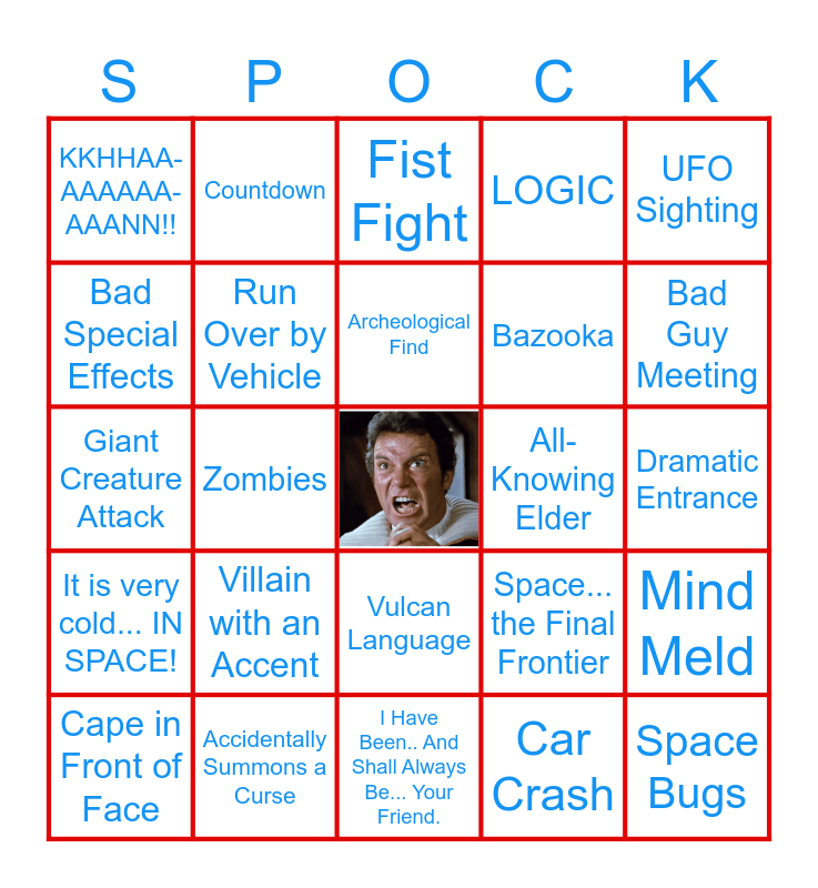 This bingo card has a free space and 24 words: Villain with an Accent, Accidentally Summons a Curse, Archeological Find, Cape in Front of Face, UFO Sighting, KKHHAA-AAAAAA-AAANN!!, Bad Special Effects, Countdown, All-Knowing Elder, Vulcan Language, Bazooka, Giant Creature Attack, Space... the Final Frontier, Mind Meld, Run Over by Vehicle, Car Crash, Dramatic Entrance, Fist Fight, Bad Guy Meeting, Zombies, Space Bugs, It is very cold... IN SPACE!, LOGIC and I Have Been.. And Shall Always Be... Your Friend..