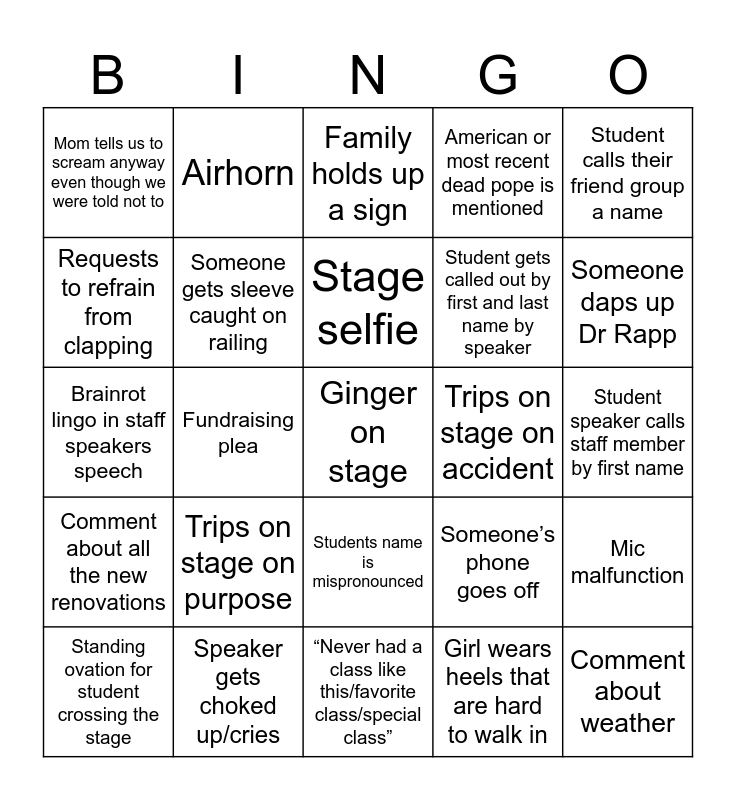 This bingo card has a free space and 24 words: Trips on stage on purpose, Speaker gets choked up/cries, Stage selfie, Standing ovation for student crossing the stage, Student calls their friend group a name, Mom tells us to scream anyway even though we were told not to, Requests to refrain from clapping, Airhorn, Trips on stage on accident, Students name is mispronounced, Student gets called out by first and last name by speaker, Brainrot lingo in staff speakers speech, Someone’s phone goes off, Mic malfunction, Someone gets sleeve caught on railing, Girl wears heels that are hard to walk in, Student speaker calls staff member by first name, Family holds up a sign, Someone daps up Dr Rapp, Fundraising plea, Comment about weather, Comment about all the new renovations, American or most recent dead pope is mentioned and “Never had a class like this/favorite class/special class”.