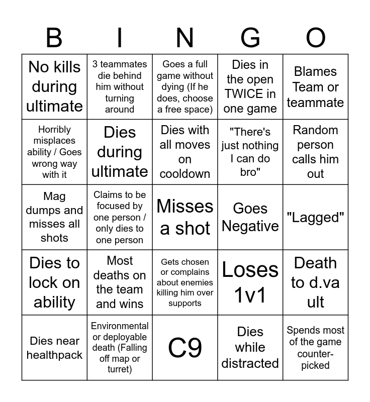This bingo card has a free space and 73 words: Goes into team alone, Fights more than 1 person by himself and dies, No kills during ultimate, Death to bad positioning, Over extends, Fat Fingers a key, Dies to lock on ability, Dies while sandwiched away from team, Loses 1v1, Loses against the person he's countering, Dies to Mei wall, Outburst of rage, Dies during ultimate, "Lagged", Spends an entire life shooting the tank and nobody else, 3 teammates die behind him without turning around, C9, Horribly misplaces ability / Goes wrong way with it, Lost more points than the game he last won, Goes Negative, Dies with all moves on cooldown, Dies in the open TWICE in one game, Blames Team or teammate, Dies while looking at Xewave / Supports, Dies near healthpack, Holds ultimate for 2 minutes, Walks off point during overtime and dies, Spawn camped or Held in spawn, Headshot death twice in one game, Misses ability up close, Environmental or deployable death (Falling off map or turret), Round 6, Not moving in spawn for more than 10 seconds, Loses 1v1 without landing a single hit, Claims to be focused by one person / only dies to one person, Most kills on team, still loses, Comparison to Marvel Rivals, Gets someone low and dies before getting final hit, Spends most of the game counter-picked, If nobody got bingo yet and Tyler gets off, fill this space out, Dies while distracted, Most deaths on the team and wins, Gives up and plays the rest of the round for fun or unserious, Successfully ragebaited 3 times without catching on, "Was that one on the bingo board?", "There's just nothing I can do bro", Goes a full game without dying (If he does, choose a free space), Dead to support, Gets 1 Shot, Mag dumps and misses all shots, Dies while being healed, Dies while CC'd (Stun, slow, trapped), Dies with status effect (Fire, Bleed), Dies to damage boost, Dies while asking for heals, Abandons team just to die, Solider Swap, Gets chosen or complains about enemies killing him over supports, Cassidy Insta-lock, Loses 0-3 on payload or 0-2 on point capture, Argues over reason of death, Misses kill because of reload, Diffed at end of game, Random person calls him out, Swaps to quickplay, Swaps role before queue, Changes a setting or crosshair mid game, Loses 1v2 to someone being healed, Death to d.va ult, Melee kill or killed (No rein), Finishes round with under 30% accuracy, Sentenced to payload princess and De-Rank.