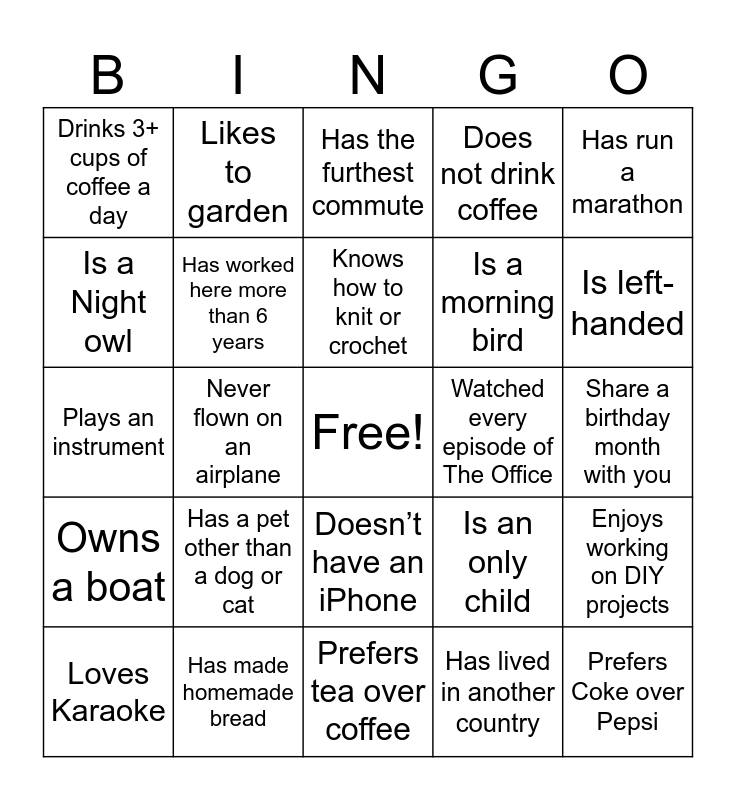 This bingo card has a free space and 29 words: Loves Karaoke, Has been Skydiving, Never flown on an airplane, Can speak 2+ Languages, Drinks 3+ cups of coffee a day, Has the furthest commute, Has worked here more than 6 years, Has a pet other than a dog or cat, Watched every episode of The Office, Has made homemade bread, Share a birthday month with you, Prefers Coke over Pepsi, Prefers tea over coffee, Has lived in another country, Is left-handed, Owns 5+ house plants, Doesn’t have an iPhone, Owns a boat, Has run a marathon, Plays an instrument, Is an only child, Has a twin, Is a morning bird, Is a Night owl, Does not drink coffee, Likes to garden, Enjoys working on DIY projects, Knows how to knit or crochet and Like pineapple on pizza.