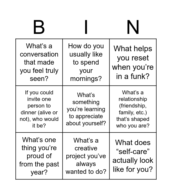 This bingo card has 99 words: What’s something fun you’re hoping to do this year?, What’s your go-to comfort show?, What’s a random skill you’d love to master?, What helps you reset when you’re in a funk?, Most used emoji?, What’s something you’ve recently tried for the first time?, What’s something nostalgic that always makes you smile?, What song feels like your personal anthem lately?, What’s your favorite way to unwind at the end of a long day?, Favorite Disney movie?, What’s something that instantly makes you feel included?, What’s a recent win you’ve had — big or small?, What’s your favorite way to spend time outdoors?, What’s a piece of advice that’s stuck with you?, Favorite brunch spot in Austin?, What’s a conversation that made you feel truly seen?, How do you usually like to spend your mornings?, What’s something that instantly lifts your mood?, If you could relive any age, what age would you pick?, What’s a compliment you’ve never forgotten?, What’s your go-to feel-good song?, If you could open a business, what would it be?, What’s a place you’ve visited that left a lasting impression?, If you were to plan a fun outdoor hangout, what would it include?, What’s a recent act of kindness you experienced or witnessed?, If you could take a class on anything for fun, what would it be?, What’s a creative project you’ve always wanted to do?, What’s something small that brings you a lot of joy?, What’s something you daydream about often?, What’s a favorite simple pleasure you enjoy regularly?, What’s something you always make time for, no matter how busy life gets?, What’s a belief or mindset that has changed for you over time?, If you could plan your dream girls’ trip, where would you go?, Favorite local coffee shop?, What’s your go-to karaoke song?, Favorite local hike?, First concert you ever went to?, What did you want to be as a kid?, What would your perfect day off look like?, What’s something you want to give yourself more credit for?, What’s a hobby you’d love to try but haven’t yet?, If you could switch lives with any celeb for a day, who would it be?, If you could invite one person to dinner (alive or not), who would it be?, What’s a small tradition you have (or want to start)?, What’s a small risk you’re glad you took?, Favorite movie to rewatch?, What’s something you're trying to do more of in your life?, How do you recharge your energy?, What does “joy” look like for you lately?, Last show you binged?, When do you feel most confident?, If you won the lottery, what’s the first thing you’d do?, What's your hidden talent?, What’s something you always say yes to?, What helps you feel grounded when life gets busy?, Have you ever been to a music festival?, What book, movie, or quote has stayed with you over time?, What’s something you’re currently learning or working on?, Song you currently have on repeat?, What’s a job you think you’d secretly be great at?, What's something you're looking forward to this month?, What’s a small thing that made you smile this week?, What’s a personal milestone you're excited for?, How long have you lived in Austin?, Most recent movie you watched?, What’s something you’re learning to appreciate about yourself?, What’s a personality trait you really admire in others?, If you could live anywhere for a year, where would it be?, What’s a goal you’re working toward this year?, What’s something you hope to do just for fun this year?, What’s one intention you’d love to carry into the rest of the year?, What does “self-care” actually look like for you?, What’s a relationship (friendship, family, etc.) that’s shaped who you are?, What podcast are you listening to?, What’s your ideal picnic snack lineup?, What do you usually bring to a potluck?, What’s one thing you’re proud of from the past year?, Favorite way to spend a Sunday?, What’s a favorite memory with a friend?, If you could give your younger self one reminder, what would it be?, What’s your favorite way to treat yourself?, What’s a moment that recently made you laugh out loud?, What helps you keep going on tough days?, What was your first job?, What’s something you’re really good at?, What’s one thing that instantly lifts your mood?, What’s a movie or show that made you feel seen?, If you could instantly master a skill, what would it be?, What’s your favorite thing to do in Austin?, What’s your ideal weekend like?, Have you ever been to Barton Springs?, What’s your dream vacation spot?, What’s a weekend ritual you love?, If you could have any superpower, what would it be?, What’s your guilty pleasure TV show?, Dream concert you’d love to go to?, What’s a random fun fact about you?, What’s one “little thing” you always look forward to? and What qualities do you value most in a friend?.