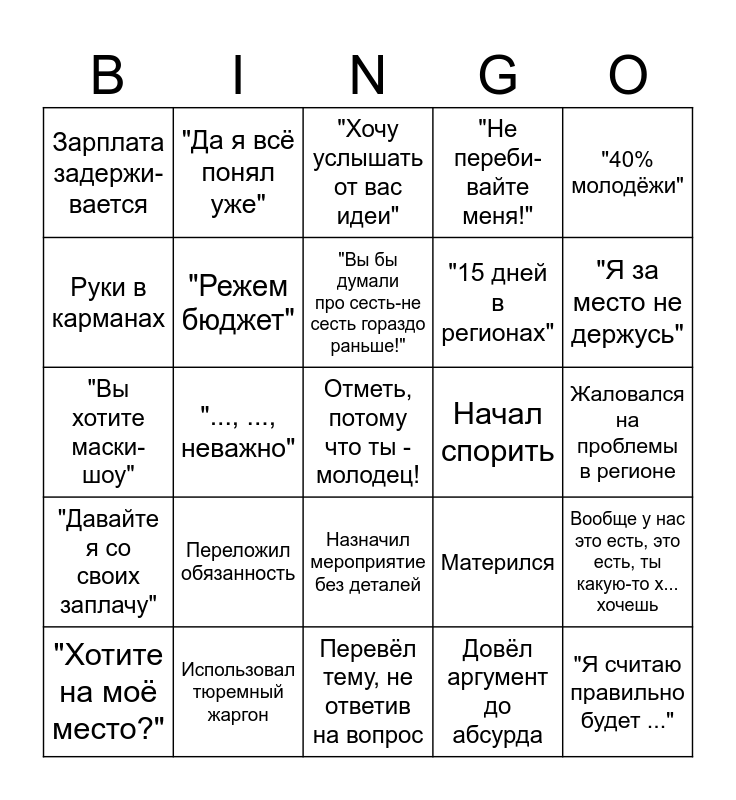 This bingo card has a free space and 29 words: "Хотите на моё место?", "Мы же одна команда", "..., ..., неважно", Согласовал волонтёрский проект, Зарплата задержи- вается, "Хочу услышать от вас идеи", "Режем бюджет", Переложил обязанность, Начал спорить, Использовал тюремный жаргон, Жаловался на проблемы в регионе, "Я считаю правильно будет ...", Перевёл тему, не ответив на вопрос, Довёл аргумент до абсурда, "Я за место не держусь", Угрожал Минюстом, Назначил мероприятие без деталей, "Давайте я со своих заплачу", "40% молодёжи", "Вы хотите маски-шоу", Матерился, "...не тратили силы на конфликт", "15 дней в регионах", Руки в карманах, "Не переби- вайте меня!", "Да я всё понял уже", Вообще у нас это есть, это есть, ты какую-то х... хочешь, "Вы бы думали про сесть-не сесть гораздо раньше!" and Вот я к вам по-человечески.