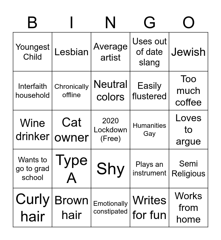 This bingo card has a free space and 24 words: Type A, Brown hair, Neutral colors, Curly hair, Jewish, Youngest Child, Interfaith household, Lesbian, Humanities Gay, Shy, Easily flustered, Wine drinker, Plays an instrument, Semi Religious, Chronically offline, Writes for fun, Loves to argue, Average artist, Too much coffee, Cat owner, Works from home, Wants to go to grad school, Uses out of date slang and Emotionally constipated.