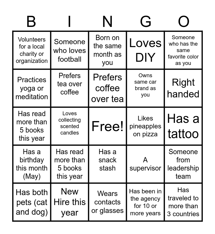 This bingo card has a free space and 24 words: Has read more than 5 books this year, New Hire this year, Prefers coffee over tea, Has both pets (cat and dog), Someone who has the same favorite color as you, Volunteers for a local charity or organization, Practices yoga or meditation, Someone who loves football, Likes pineapples on pizza, Has a snack stash, Owns same car brand as you, Has read more than 5 books this year, A supervisor, Someone from leadership team, Prefers tea over coffee, Has been in the agency for 10 or more years, Has a tattoo, Born on the same month as you, Right handed, Loves collecting scented candles, Has traveled to more than 3 countries, Has a birthday this month (May), Loves DIY and Wears contacts or glasses.