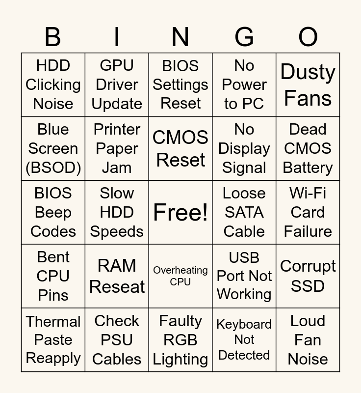 This bingo card has a free space and 24 words: RAM Reseat, Check PSU Cables, CMOS Reset, Thermal Paste Reapply, Dusty Fans, HDD Clicking Noise, Blue Screen (BSOD), GPU Driver Update, Loose SATA Cable, Overheating CPU, No Display Signal, BIOS Beep Codes, USB Port Not Working, Corrupt SSD, Printer Paper Jam, Keyboard Not Detected, Wi-Fi Card Failure, BIOS Settings Reset, Dead CMOS Battery, Slow HDD Speeds, Loud Fan Noise, Bent CPU Pins, No Power to PC and Faulty RGB Lighting.