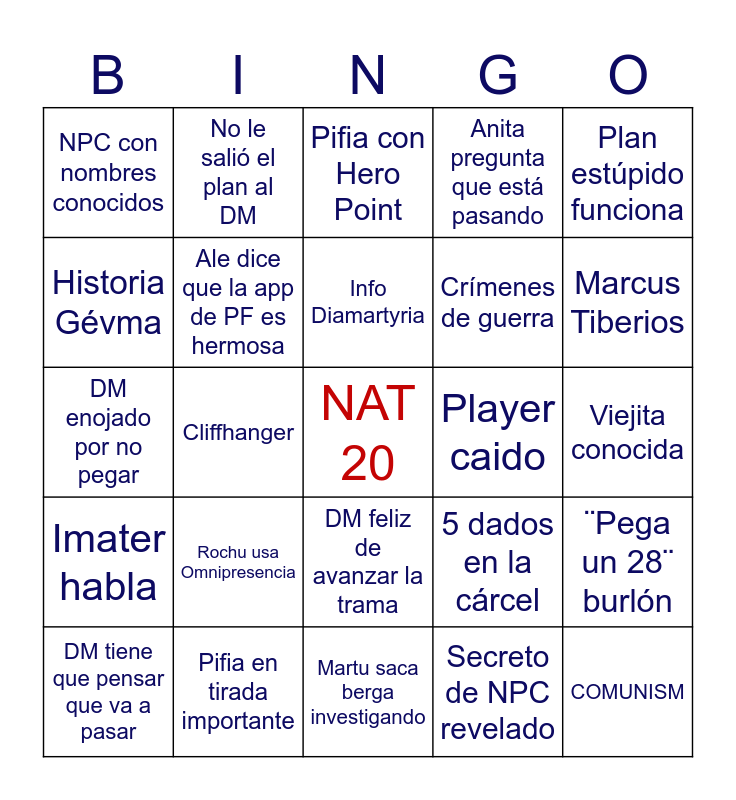 This bingo card has a free space and 24 words: Rochu usa Omnipresencia, Pifia en tirada importante, Info Diamartyria, DM tiene que pensar que va a pasar, Plan estúpido funciona, NPC con nombres conocidos, Historia Gévma, No le salió el plan al DM, Player caido, DM feliz de avanzar la trama, Crímenes de guerra, DM enojado por no pegar, 5 dados en la cárcel, ¨Pega un 28¨ burlón, Ale dice que la app de PF es hermosa, Secreto de NPC revelado, Viejita conocida, Pifia con Hero Point, Marcus Tiberios, Cliffhanger, COMUNISM, Imater habla, Anita pregunta que está pasando and Martu saca berga investigando.