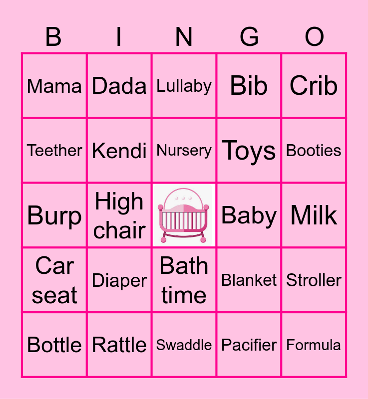 This bingo card has a free space and 24 words: Bottle, Diaper, Nursery, Pacifier, Crib, Mama, Dada, Lullaby, Baby, Milk, Burp, Kendi, Blanket, Stroller, Teether, Rattle, Swaddle, Bib, Booties, Car seat, High chair, Bath time, Toys and Formula.