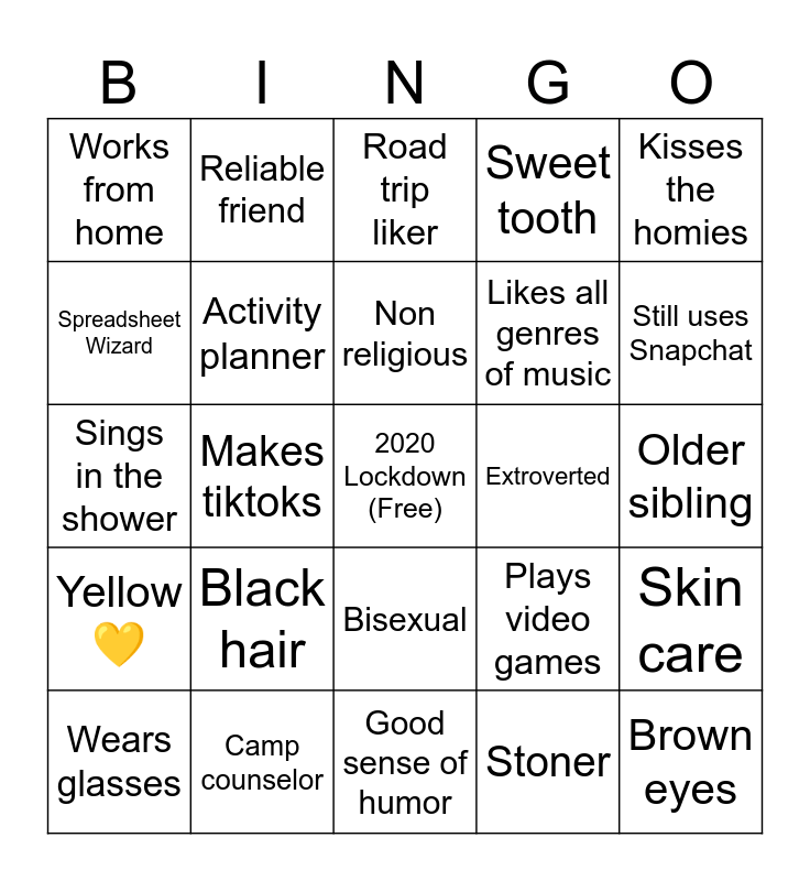 This bingo card has a free space and 24 words: Black hair, Camp counselor, Non religious, Wears glasses, Kisses the homies, Works from home, Spreadsheet Wizard, Reliable friend, Extroverted, Bisexual, Likes all genres of music, Sings in the shower, Plays video games, Skin care, Activity planner, Stoner, Older sibling, Road trip liker, Still uses Snapchat, Makes tiktoks, Brown eyes, Yellow 💛, Sweet tooth and Good sense of humor.