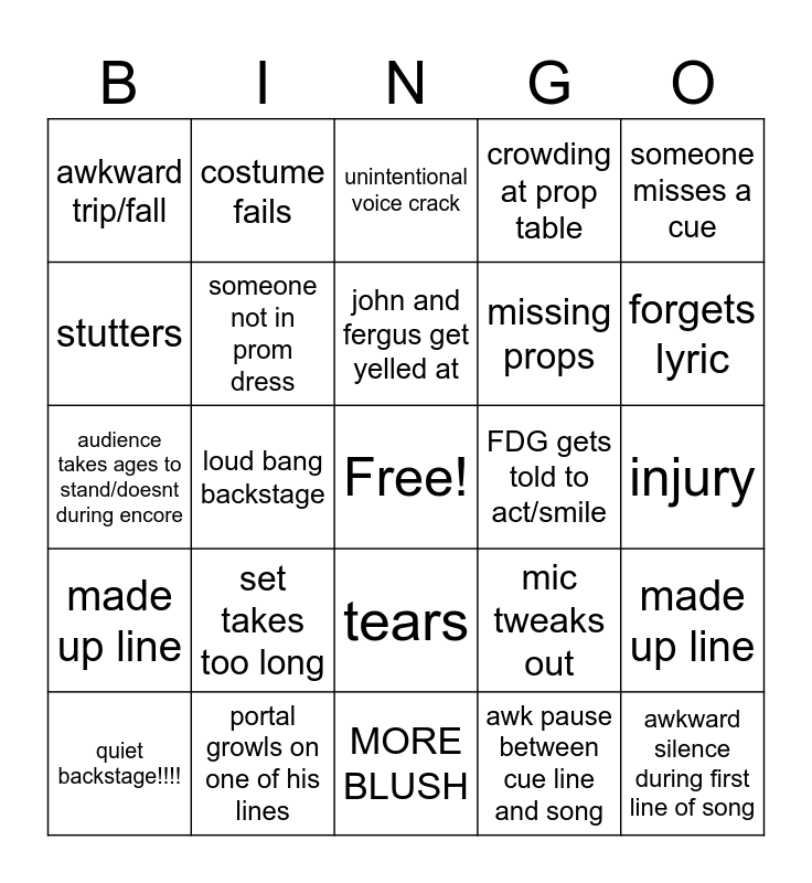 This bingo card has a free space and 24 words: set takes too long, portal growls on one of his lines, john and fergus get yelled at, quiet backstage!!!!, someone misses a cue, awkward trip/fall, stutters, costume fails, FDG gets told to act/smile, tears, missing props, audience takes ages to stand/doesnt during encore, mic tweaks out, made up line, someone not in prom dress, awk pause between cue line and song, injury, unintentional voice crack, forgets lyric, loud bang backstage, awkward silence during first line of song, made up line, crowding at prop table and MORE BLUSH.