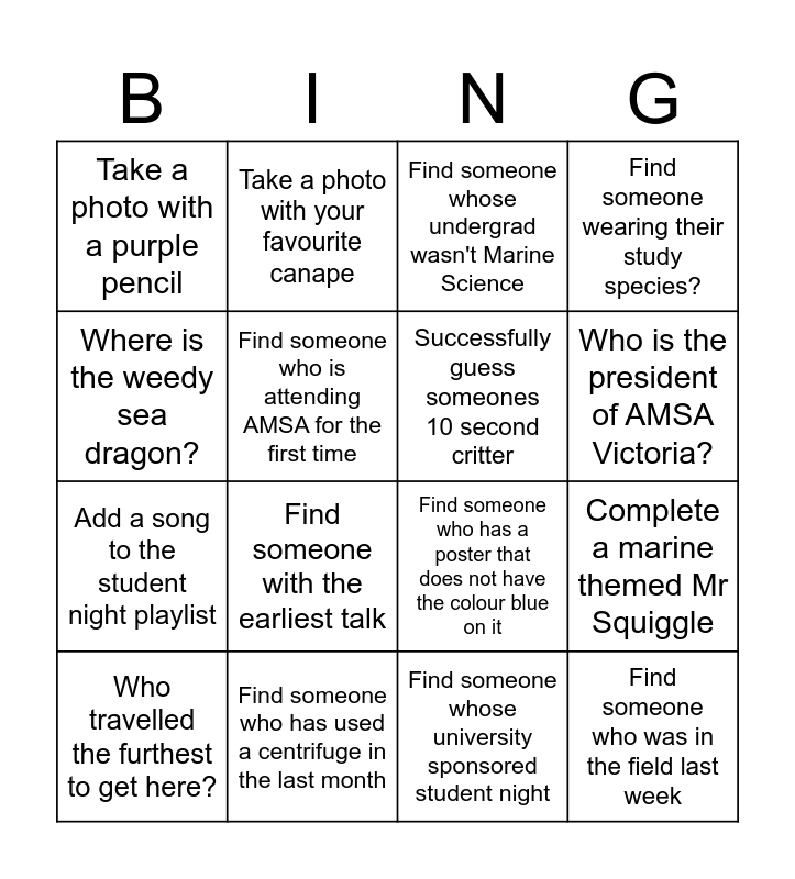 This bingo card has 16 words: Find someone who has used a centrifuge in the last month, Complete a marine themed Mr Squiggle, Find someone whose undergrad wasn't Marine Science, Take a photo with a purple pencil, Add a song to the student night playlist, Take a photo with your favourite canape, Find someone who has a poster that does not have the colour blue on it, Find someone whose university sponsored student night, Where is the weedy sea dragon?, Find someone who is attending AMSA for the first time, Who travelled the furthest to get here?, Find someone wearing their study species?, Find someone with the earliest talk, Who is the president of AMSA Victoria?, Successfully guess someones 10 second critter and Find someone who was in the field last week.
