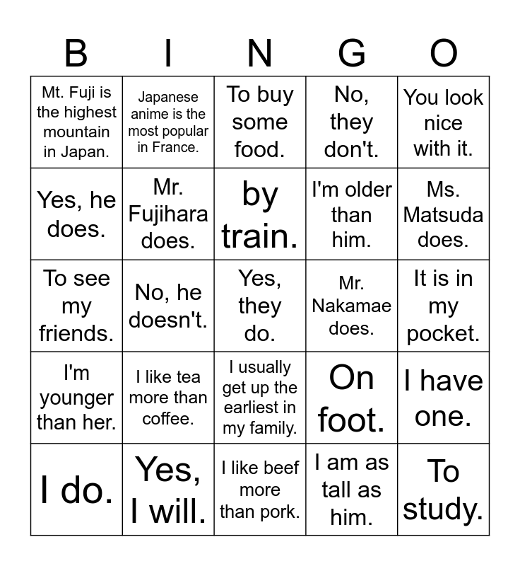 This bingo card has 37 words: Free!, By bus., By bike., by train., On foot., To study., To see my friends., In the teacher's room., To buy some food., To be a better teacher., It is in my pocket., Yes, he does., No, he doesn't., Yes, they do., No, they don't., I have one., I have two., Japanese anime is the most popular in France., I usually get up the earliest in my family., I'm older than him., You look nice with it., I'm younger than her., I like tea more than coffee., I like beef more than pork., I like wine the best of all drinks., I like to go skiing., Mt. Fuji is the highest mountain in Japan., Yes, I will., He is younger than me., I am as tall as him., I have as many books as Haruki., I do., Mr. Fujihara does., Ms. Takamori does., Mr. Nakamae does., Ms. Matsuda does. and It's mine..