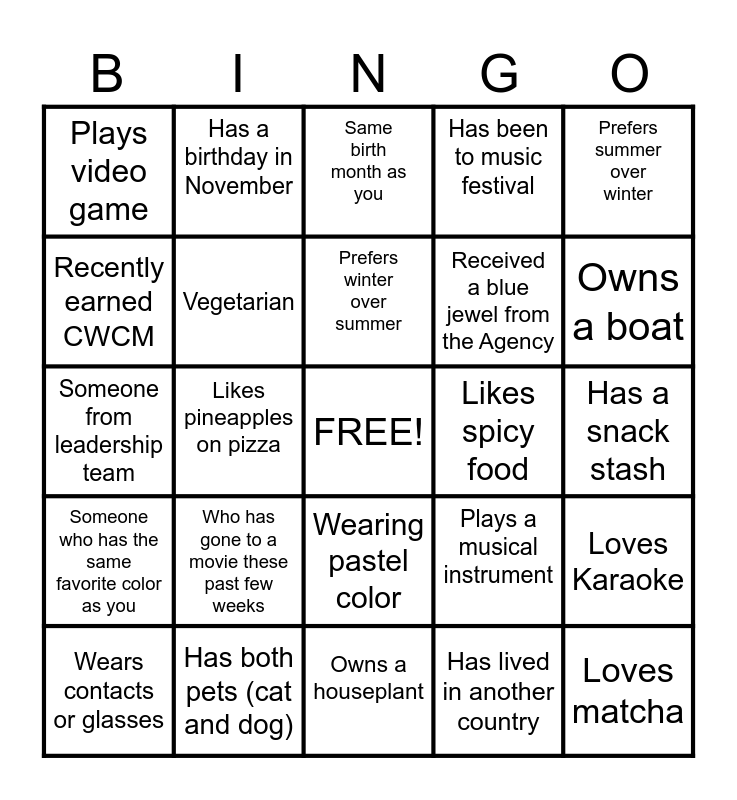 This bingo card has a free space and 24 words: Who has gone to a movie these past few weeks, Has both pets (cat and dog), Prefers winter over summer, Wears contacts or glasses, Prefers summer over winter, Plays video game, Recently earned CWCM, Has a birthday in November, Likes spicy food, Wearing pastel color, Received a blue jewel from the Agency, Someone from leadership team, Plays a musical instrument, Loves Karaoke, Vegetarian, Has lived in another country, Has a snack stash, Same birth month as you, Owns a boat, Likes pineapples on pizza, Loves matcha, Someone who has the same favorite color as you, Has been to music festival and Owns a houseplant.