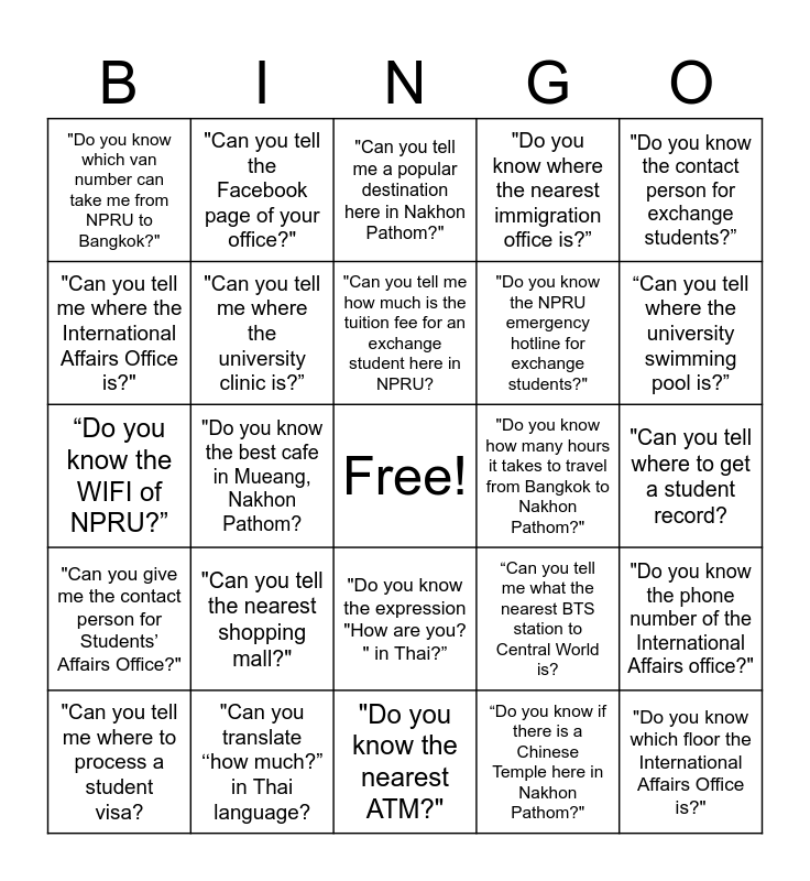This bingo card has a free space and 35 words: "Can you tell me how much is a taxi ride from Nakhon Pathom to Bangkok?, “Do you know which MRT station is nearest to ICON Siam?”, "Do you know the official website of NPRU?, "Can you tell me where the university clinic is?”, "Do you know the expression "How are you? " in Thai?”, "Do you know where the nearest immigration office is?”, "Can you tell me where the International Affairs Office is?", "Do you know the best place to experience a Fullmoon Party?", "Can you tell me how much is the tuition fee for an exchange student here in NPRU?, "Do you know where the Student Affairs building is?", “Do you know the WIFI of NPRU?”, "Do you know the contact person for exchange students?”, "Do you know if I can take a shower here at the university?”, "Can you tell me where to buy a new phone sim card?", "Do you know which van number can take me from NPRU to Bangkok?", "Do you know how many hours it takes to travel from Bangkok to Nakhon Pathom?", “Do you know if there is a Chinese Temple here in Nakhon Pathom?", "Do you know the best cafe in Mueang, Nakhon Pathom?, "Can you give me the contact person for Students’ Affairs Office?", "Do you know which floor the International Affairs Office is?", “Can you tell me what the nearest BTS station to Central World is?, "Can you tell me where to process a student visa?, "Do you know the phone number of the International Affairs office?", "Can you translate ‘‘how much?” in Thai language?, "Can you tell me a popular destination here in Nakhon Pathom?", “Can you tell where the university swimming pool is?”, “Do you know if there is a Catholic Church here in Nakhon Pathom"?, “Do you know the best food product here in Thailand?”, "Do you know the NPRU emergency hotline for exchange students?", "Can you tell where to get a student record?, "Do you know the official phone number of NPRU?, "Do you know the nearest ATM?", "Can you tell the nearest shopping mall?", "Can you tell the Facebook page of your office?" and “Can you tell what is the Thai translation for ‘Thank you”?.