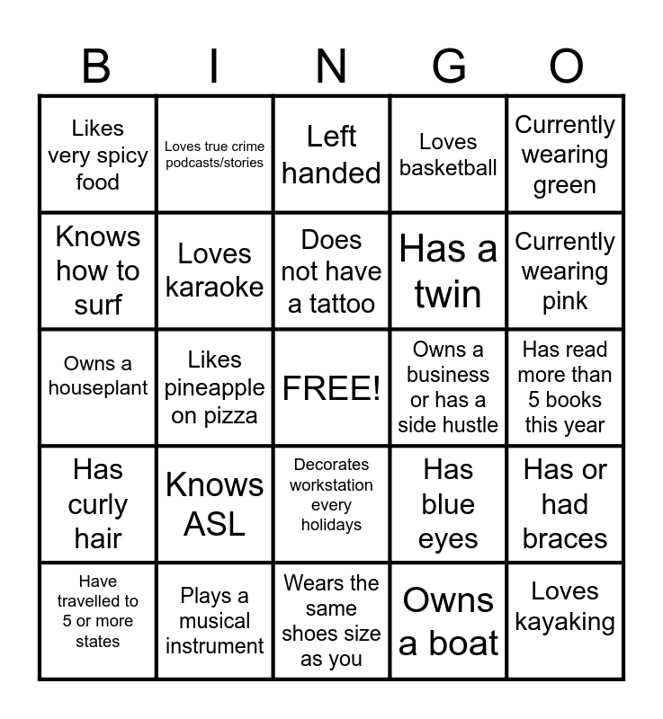This bingo card has a free space and 24 words: Knows ASL, Plays a musical instrument, Does not have a tattoo, Have travelled to 5 or more states, Currently wearing green, Likes very spicy food, Knows how to surf, Loves true crime podcasts/stories, Owns a business or has a side hustle, Decorates workstation every holidays, Has a twin, Owns a houseplant, Has blue eyes, Has or had braces, Loves karaoke, Owns a boat, Has read more than 5 books this year, Left handed, Currently wearing pink, Likes pineapple on pizza, Loves kayaking, Has curly hair, Loves basketball and Wears the same shoes size as you.