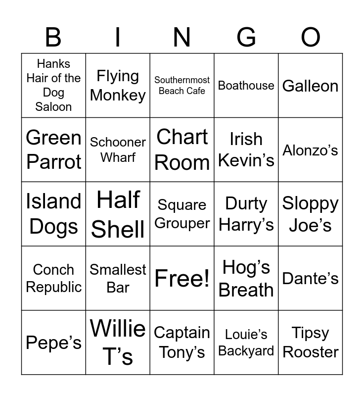 This bingo card has 26 words: Free!, Louie’s Backyard, Chart Room, Willie T’s, Galleon, Hanks Hair of the Dog Saloon, Green Parrot, Flying Monkey, Sloppy Joe’s, Hog’s Breath, Irish Kevin’s, Island Dogs, Dante’s, Pepe’s, Half Shell, Key West Bait and Tackle, Boathouse, Conch Republic, Southernmost Beach Cafe, Square Grouper, Alonzo’s, Captain Tony’s, Durty Harry’s, Smallest Bar, Schooner Wharf and Tipsy Rooster.