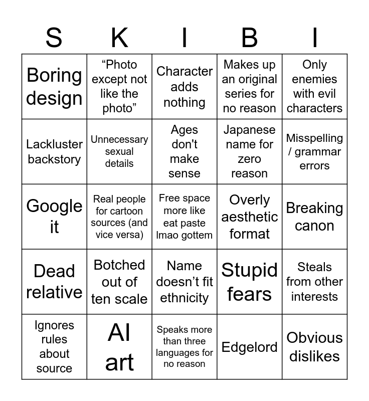 This bingo card has a free space and 60 words: Stolen art, AI art, Overly traumatic backstory, Dead relative, Edgelord, Wittle baby, Unnecessary sexual details, Interacts w/ character they shouldn't know, Japanese name for zero reason, Animal ears for zero reason, Makes up an original series for no reason, Name doesn't fit source, Lackluster backstory, No backstory, Love interest is a silly, Boring design, Obvious dislikes, Only enemies with evil characters, Knows something they shouldn't, Ages don't make sense, Overly aesthetic format, Character adds nothing, Ignores rules about source, Steals from other interests, Theme song doesn't match, Nicknames don't fit, Unnecessary powers, Character answers the form themselves, Misspelling / grammar errors, Straight up unlikeable, Backup love interest, "Crush: your oc", Quirky medical condition, Thing to make the OC look righteous, “Photo except not like the photo”, Makes another character evil, Age range, Real people for cartoon sources (and vice versa), Heinous act against humanity, Google it, Unknown as an answer to part of the form, Botched out of ten scale, Breaking canon, Pretentious name, Stupid fears, Contradiction, Two characters from the same person have same love interest, Below 5’0”, Car crash, Name doesn’t fit ethnicity, Speaks more than three languages for no reason, Has more than three names, Lists a group of people as a friend, Random pet with no relevance, Dates another OC, Changes facts about real characters, Not like other girls, Y/N, not an OC, Nepo baby and Born on a holiday.