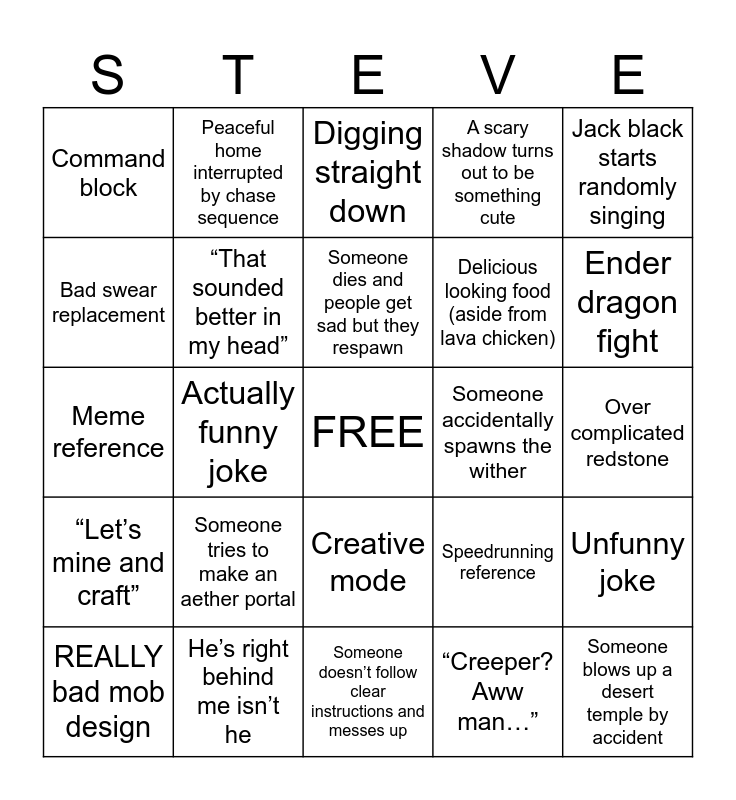 This bingo card has a free space and 34 words: “123 Minecraft!”, “Creeper? Aww man…”, YouTuber reference, Corny joke, “Let’s mine and craft”, “That sounded better in my head”, Jack black starts randomly singing, REALLY bad mob design, Peaceful home interrupted by chase sequence, Someone tries to sleep in the nether, Someone dies and people get sad but they respawn, Digging straight down, Making fun of game mechanics, 2 people slowly turn to face each other when something bad happens, Someone accidentally spawns the wither, Ender dragon fight, He’s right behind me isn’t he, Meme reference, Someone tries to make an aether portal, Speedrunning reference, Creative mode, Herobrine, Command block, Over complicated redstone, Someone doesn’t follow clear instructions and messes up, Someone blows up a desert temple by accident, A scary shadow turns out to be something cute, Blacksmith house looting, Delicious looking food (aside from lava chicken), Bad swear replacement, Cliffhanger, Actually funny joke, Unfunny joke and Obvious product placement.