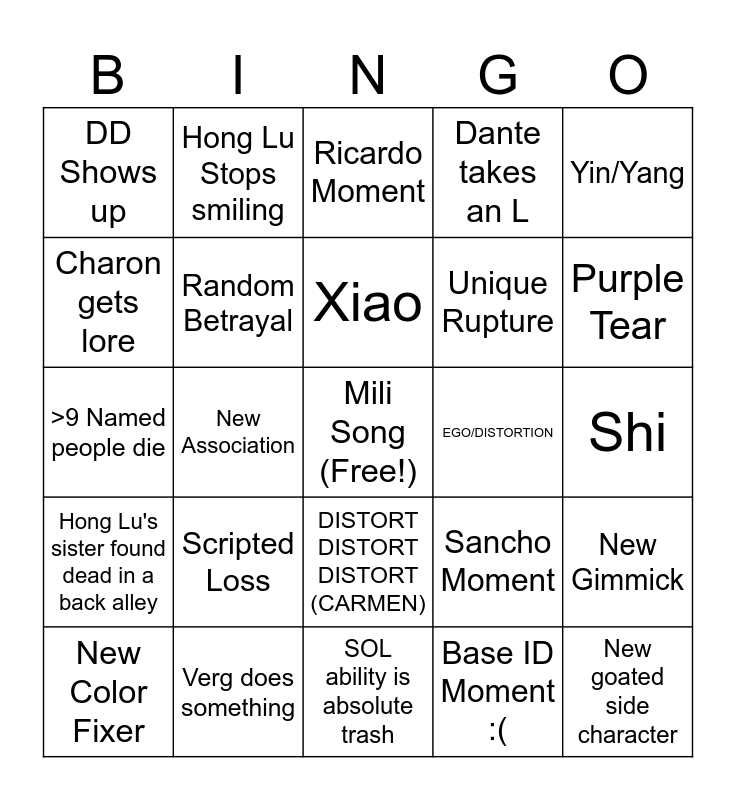 This bingo card has a free space and 24 words: Scripted Loss, Verg does something, Xiao, New Color Fixer, Yin/Yang, DD Shows up, Charon gets lore, Hong Lu Stops smiling, EGO/DISTORTION, DISTORT DISTORT DISTORT (CARMEN), Unique Rupture, >9 Named people die, Sancho Moment, New Gimmick, Random Betrayal, Base ID Moment :(, Shi, Ricardo Moment, Purple Tear, New Association, New goated side character, Hong Lu's sister found dead in a back alley, Dante takes an L and SOL ability is absolute trash.