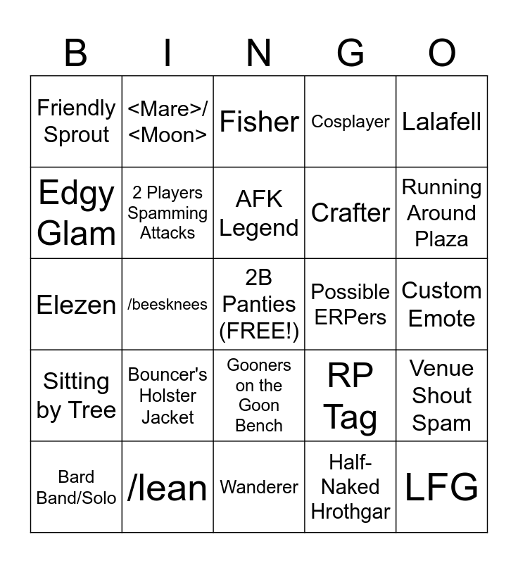 This bingo card has a free space and 24 words: Bouncer's Holster Jacket, /lean, AFK Legend, Bard Band/Solo, Lalafell, Friendly Sprout, Edgy Glam, <Mare>/ <Moon>, Possible ERPers, Gooners on the Goon Bench, Crafter, Elezen, RP Tag, Venue Shout Spam, 2 Players Spamming Attacks, Half-Naked Hrothgar, Custom Emote, Fisher, Running Around Plaza, /beesknees, LFG, Sitting by Tree, Cosplayer and Wanderer.