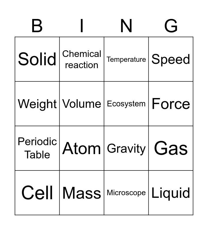 This bingo card has 16 words: Mass, Gas, Temperature, Solid, Periodic Table, Chemical reaction, Gravity, Microscope, Weight, Volume, Cell, Speed, Atom, Force, Ecosystem and Liquid.