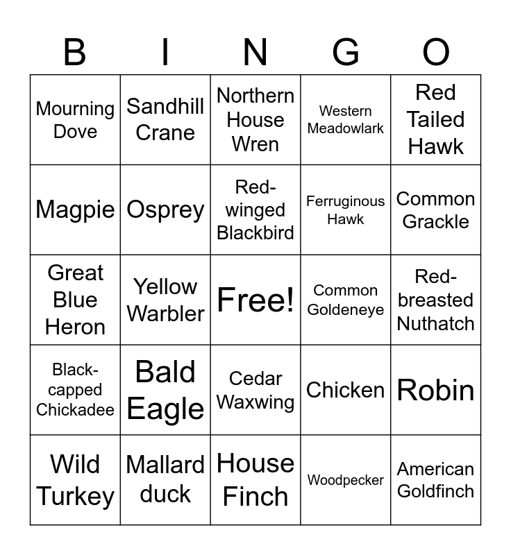 This bingo card has a free space and 24 words: Bald Eagle, Mallard duck, Red-winged Blackbird, Wild Turkey, Red Tailed Hawk, Mourning Dove, Magpie, Sandhill Crane, Common Goldeneye, Cedar Waxwing, Ferruginous Hawk, Great Blue Heron, Chicken, Robin, Osprey, Woodpecker, Red-breasted Nuthatch, Northern House Wren, Common Grackle, Yellow Warbler, American Goldfinch, Black-capped Chickadee, Western Meadowlark and House Finch.