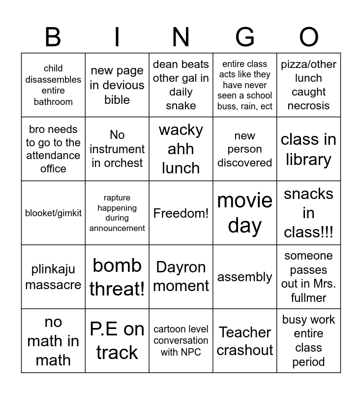 This bingo card has a free space and 39 words: random food thrown for now reason, kid threatens fight for no reason, literally a robbery at locker, No instrument in orchest, no math in math, Dayron moment, wacky ahh lunch, whack schedule, pizza/other lunch caught necrosis, plinkaju massacre, rapture happening during announcement, entire class acts like they have never seen a school buss, rain, ect, busy work entire class period, snacks in class!!!, movie day, bomb threat!, someone loses the ability to speak, child disassembles entire bathroom, the F students are inventors. they are so creative, they can't listen to whats happening in class because, assembly, bro needs to go to the attendance office, cartoon level conversation with NPC, new person discovered, class in library, drill of some sort, somebody dies, 400 assignments, 1 day to complete, random citizenship drop for litteraly no reason, someone drinks cashew water, new page in devious bible, someone says "thats not vuulinox", someone says "thats what she said", dean beats other gal in daily snake, P.E on track, Teacher crashout, Everette forgets to de-equip hat, someone passes out in Mrs. fullmer, blooket/gimkit and There are no birthdays today!.