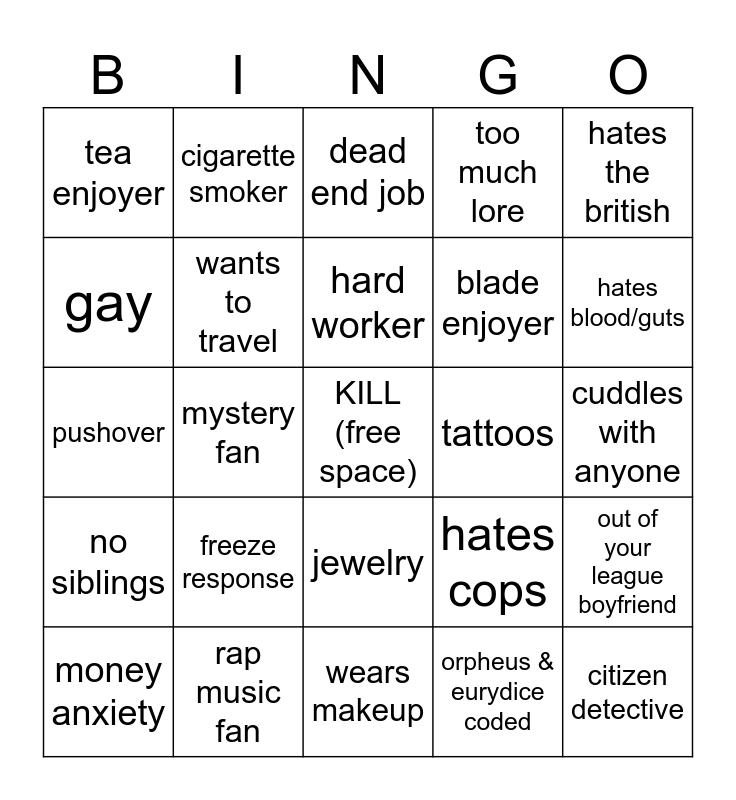 This bingo card has a free space and 24 words: freeze response, rap music fan, hard worker, money anxiety, hates the british, tea enjoyer, gay, cigarette smoker, tattoos, jewelry, blade enjoyer, pushover, hates cops, out of your league boyfriend, wants to travel, orpheus & eurydice coded, cuddles with anyone, dead end job, hates blood/guts, mystery fan, citizen detective, no siblings, too much lore and wears makeup.