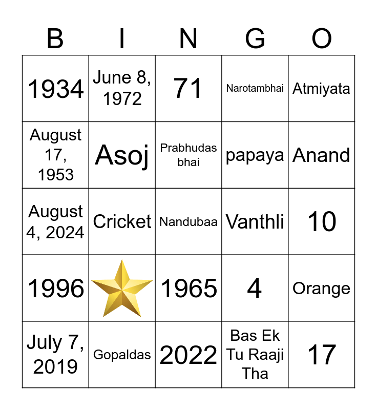 This bingo card has 1 images and 24 words: 2022, Prabhudas bhai, July 7, 2019, Atmiyata, 1934, August 17, 1953, June 8, 1972, Vanthli, 1965, papaya, August 4, 2024, 4, Orange, Asoj, 17, 10, 71, Anand, Cricket, Nandubaa, Gopaldas, 1996, Narotambhai and Bas Ek Tu Raaji Tha.