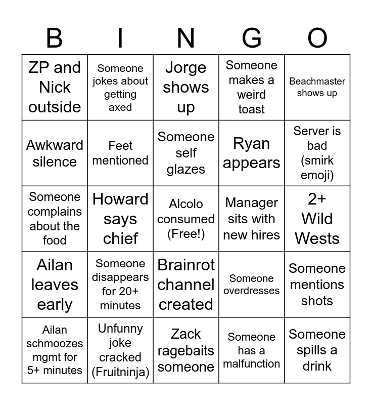 This bingo card has a free space and 29 words: Ailan schmoozes mgmt for 5+ minutes, 6+ new hires at one table, Howard says chief, A Zack pregames, ZP and Nick outside, Jorge shows up, Feet mentioned, Someone disappears for 20+ minutes, Manager sits with new hires, Unfunny joke cracked (Fruitninja), 2+ Wild Wests, Someone spills a drink, Zack ragebaits someone, Someone has a malfunction, Server is bad (smirk emoji), Someone says they don't drink Subtract Finn, Brainrot channel created, Ailan leaves early, Beachmaster shows up, Someone complains about the food, Someone overdresses, Table/Chair wobbly, Ryan appears, Awkward silence, Someone makes a weird toast, Someone jokes about getting axed, Someone mentions shots, Someone self glazes and Someone invites a +1 no one knows.