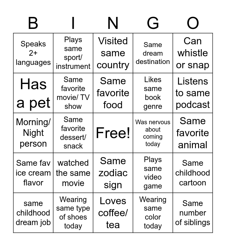This bingo card has a free space and 33 words: Same birth month, Born in same city/ town, Same favorite food, Same hobby, Same favorite animal, Speaks 2+ languages, Same favorite movie/ TV show, Loves coffee/ tea, Likes same book genre, Same number of siblings, Has a pet, Plays same sport/ instrument, Wearing same color today, Same favorite season, Morning/ Night person, Same favorite dessert/ snack, Same zodiac sign, Plays same video game, Same childhood cartoon, Same fav ice cream flavor, Wearing same type of shoes today, Had a part-time job, Same dream destination, Listens to same podcast, Shares your fear, watched the same movie, Visited same country, Was nervous about coming today, Can whistle or snap, same childhood dream job, Attended to concert/ musical show, Same phone brand and Same favorite color.