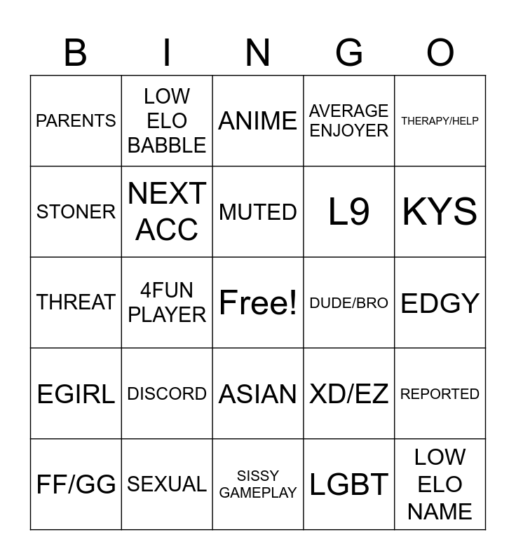 This bingo card has a free space and 24 words: DISCORD, SEXUAL, MUTED, FF/GG, THERAPY/HELP, PARENTS, STONER, LOW ELO BABBLE, DUDE/BRO, ASIAN, L9, THREAT, XD/EZ, REPORTED, NEXT ACC, LGBT, EDGY, ANIME, KYS, 4FUN PLAYER, LOW ELO NAME, EGIRL, AVERAGE ENJOYER and SISSY GAMEPLAY.