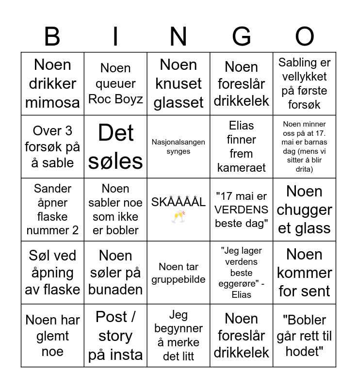 This bingo card has a free space and 24 words: Noen søler på bunaden, Post / story på insta, Nasjonalsangen synges, Noen har glemt noe, Sabling er vellykket på første forsøk, Noen drikker mimosa, Over 3 forsøk på å sable, Noen queuer Roc Boyz, "17 mai er VERDENS beste dag", Noen tar gruppebilde, Elias finner frem kameraet, Sander åpner flaske nummer 2, "Jeg lager verdens beste eggerøre" - Elias, Noen kommer for sent, Det søles, Noen foreslår drikkelek, Noen chugger et glass, Noen knuset glasset, Noen minner oss på at 17. mai er barnas dag (mens vi sitter å blir drita), Noen sabler noe som ikke er bobler, "Bobler går rett til hodet", Søl ved åpning av flaske, Noen foreslår drikkelek and Jeg begynner å merke det litt.