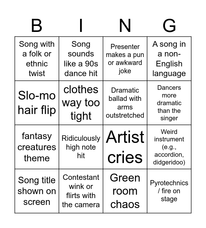 This bingo card has 36 words: clothes change mid-song, A wind machine in action, Glittery outfit overload, Dramatic ballad with arms outstretched, Lyrics mention "love", Pyrotechnics / fire on stage, Dancers more dramatic than the singer, LED floor or wall graphics go wild, Slo-mo hair flip, Male singer in a deep V-neck, Weird instrument (e.g., accordion, didgeridoo), A song in a non-English language, Singer uses a prop (e.g., chair, umbrella), Contestant wink or flirts with the camera, Ridiculously high note hit, Song with a folk or ethnic twist, Giant moon/stars/hearts on screen, Performer does a spin or twirl, Song title shown on screen, Presenter makes a pun or awkward joke, Green room chaos, Overly dramatic facial expressions, Statement fashion (cape, wings, feathers…), Synchronized dance routine, A flag wave seen in the crowd, Song sounds like a 90s dance hit, Artist cries, Wearing armor, fantasy creatures theme, clothes way too tight, missed tone, hug on a stage, singer lifted into the air, sending kisses to audience, camera focus on hand and camera does 360.