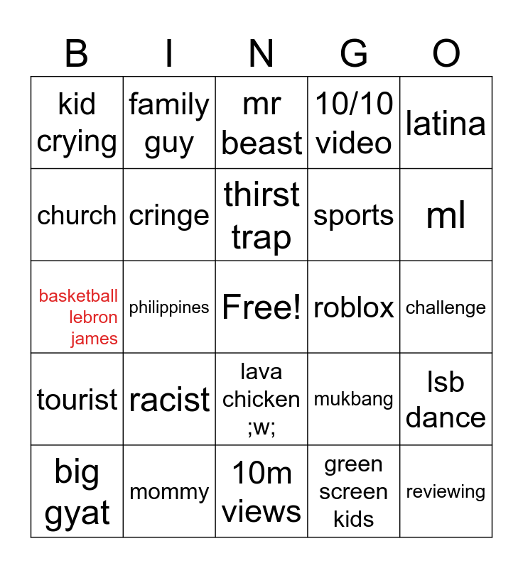 This bingo card has a free space and 24 words: racist, mommy, thirst trap, big gyat, latina, kid crying, church, family guy, roblox, lava chicken ;w;, sports, basketball lebron james, mukbang, lsb dance, cringe, green screen kids, challenge, mr beast, ml, philippines, reviewing, tourist, 10/10 video and 10m views.