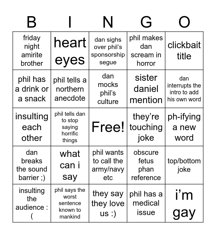 This bingo card has a free space and 24 words: what can i say, phil says the worst sentence known to mankind, dan mocks phil’s culture, insulting the audience :(, clickbait title, friday night amirite brother, phil has a drink or a snack, heart eyes, they’re touching joke, phil wants to call the army/navy etc, sister daniel mention, insulting each other, obscure fetus phan reference, top/bottom joke, phil tells a northern anecdote, phil has a medical issue, ph-ifying a new word, dan sighs over phil’s sponsorship segue, dan interrupts the intro to add his own word, phil tells dan to stop saying horrific things, i’m gay, dan breaks the sound barrier ;), phil makes dan scream in horror and they say they love us :).