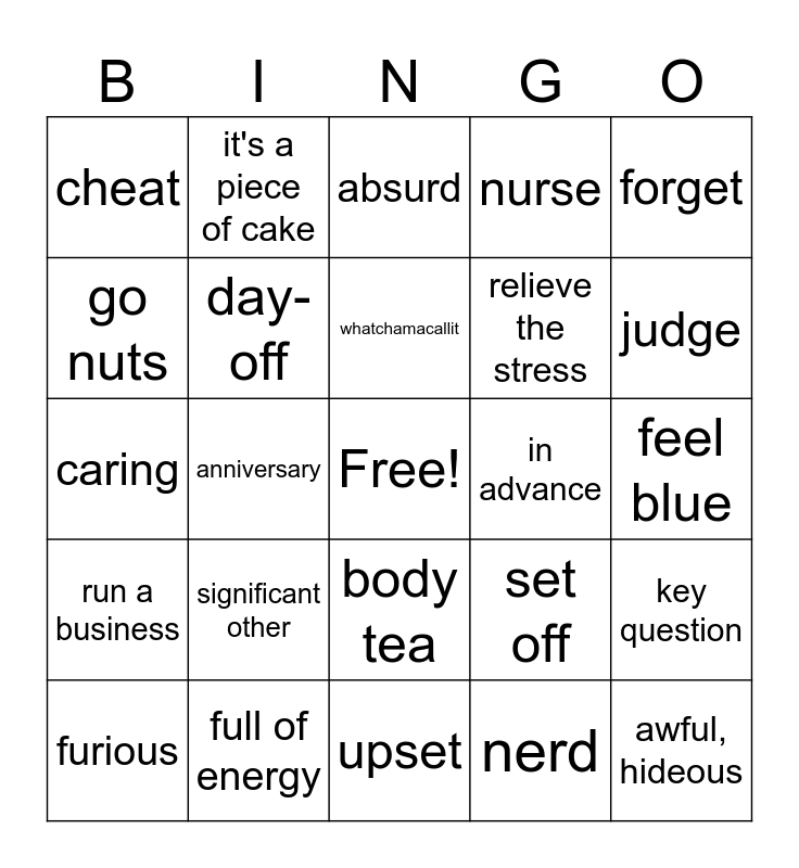 This bingo card has a free space and 24 words: significant other, full of energy, whatchamacallit, furious, forget, cheat, go nuts, it's a piece of cake, in advance, body tea, relieve the stress, caring, set off, key question, day-off, nerd, feel blue, absurd, judge, anniversary, awful, hideous, run a business, nurse and upset.